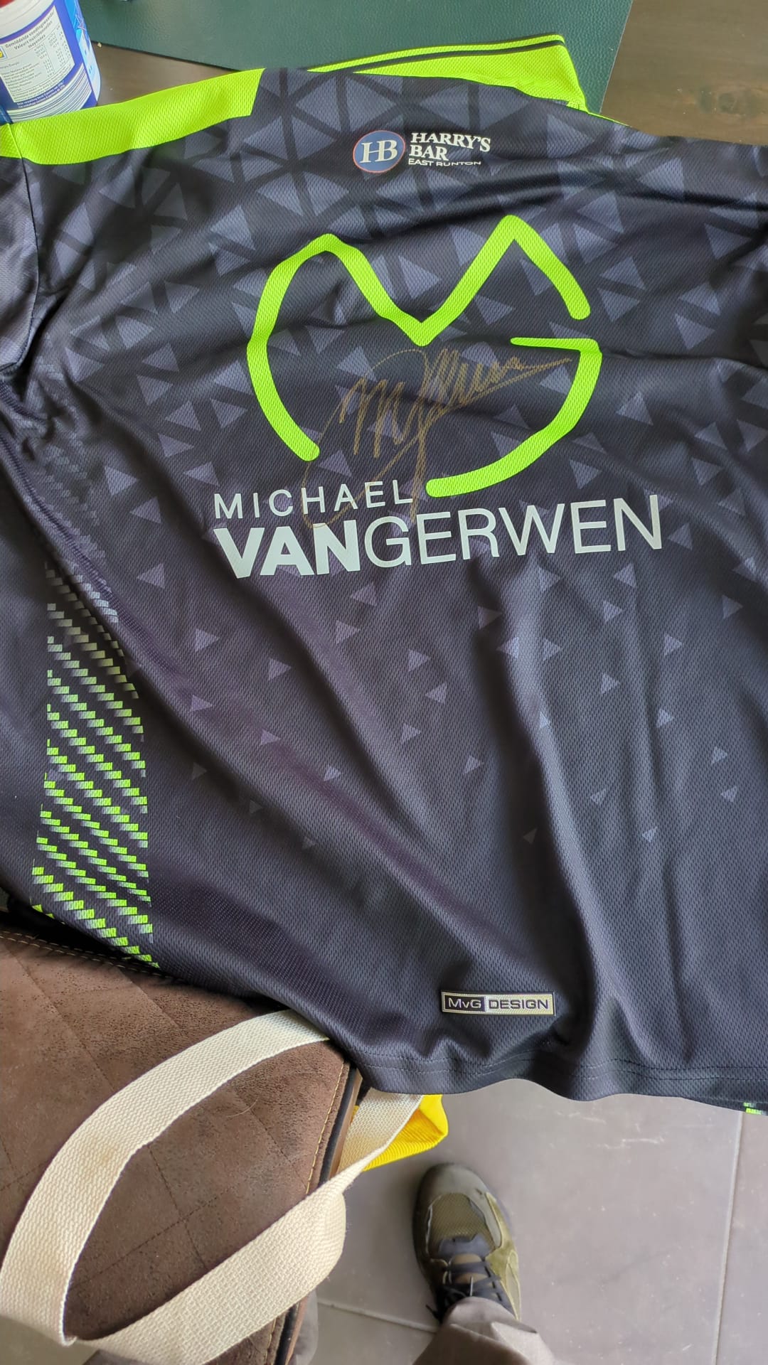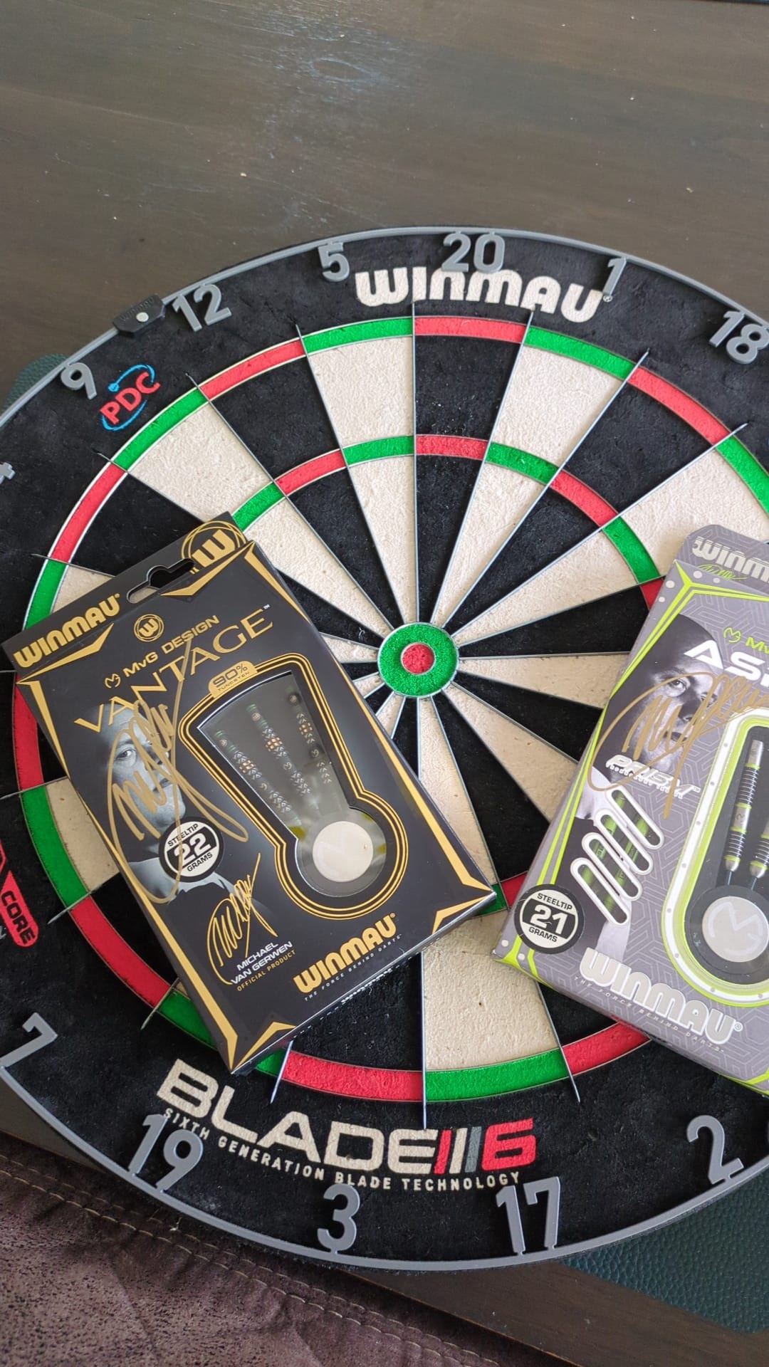 Bied op een exclusief dartpakket van Michael van Gerwen, een droom voor iedere dartliefhebber. Dit bijzondere pakket bestaat uit het persoonlijke dartbord van Michael zelf, voorzien van zijn handtekening, maar ook uit 2 sets dartpijlen én een gesigneerd westrijdshirt. Een zeldzaam en waardevol item voor fans en verzamelaars, dat sportgeschiedenis in huis brengt. Perfect om te showen in je mancave of dartkamer. Mis deze unieke kans niet om een echt stukje van Mighty Mike in handen te krijgen.